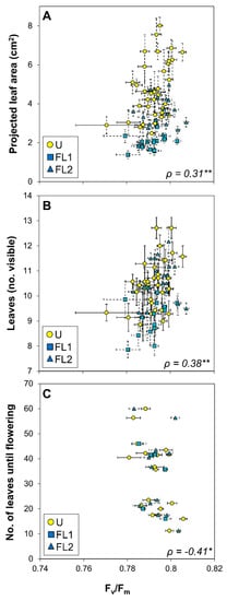 For a more detailed view of the interrelations between chlorophyll a fluorescence, growth, and development data, we constructed a correlation matrix between the average values for each accession and the measured variable, and we included latitude of origin and the number of leaves formed until flowering (Table 1). Strong correlations between most chlorophyll a fluorescence parameters (except for the relationship between NPQ and Fv/Fm) and all growth and developmental parameters were found (Table 2). Average leaf size correlated strongly and positively with ΦPSII, and negatively with NPQ (Figure 5), suggesting that light use efficiency had positive effects on leaf growth. These correlations are especially apparent for plants grown under U (yellow symbols in Figure 5). Both projected leaf area and the number of visible leaves correlated positively with Fv/Fm (Figure 6A,B). Also, Fv/Fm correlated negatively with the number of leaves formed until flowering (Figure 6C).