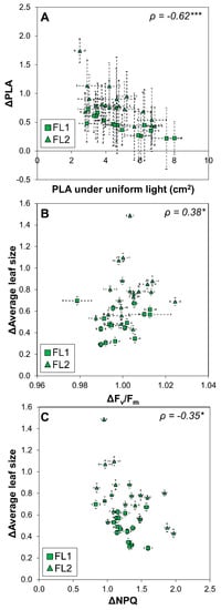 Changes in growth and chlorophyll a fluorescence in 36 Arabidopsis accessions grown under fluctuating compared to uniform light. (A) Relationship between projected leaf area (PLA) under uniform light and the response ratio of PLA under fluctuating light divided by PLA under uniform light (Δ = FL/U), (B) relationship between the response ratio of average leaf size and the response ratio of photosystem II maximum quantum efficiency (ΔFv/Fm), and (C) relationship between the response ratio of average leaf size and the response ratio of non-photochemical quenching (ΔNPQ). Data are sorted by FL experiment 1 (squares) and FL experiment 2 (triangles). Averages ± SE (n = 5–7). Spearman’s ρ and the significance of a linear correlation through all points is shown (*** = p <0.001, * = p< 0.05).