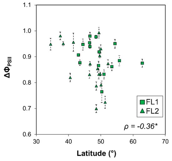 The response ratio (FL/U) of PLA correlated strongly and negatively with PLA of plants grown under U (Figure 7A), suggesting that the reduction in PLA under FL was strongest in plants that showed high growth under U. The response ratio of average leaf size correlated positively with ΔFv/Fm and negatively with ΔNPQ (Figure 7B,C), again suggesting that leaf growth was directly related to rates of photoprotection and photoinhibition. Interestingly, the latitude of origin correlated negatively with ΔΦPSII (Figure 8), revealing a trend for photosynthesis of accessions collected further north on the globe to be more negatively affected by FL. Lastly, both the response ratio of projected leaf area and of number of visible leaves correlated positively with ΔFv/Fm, but this correlation was less meaningful given the large uncertainty around the mean for values of single accessions (Figure S2).