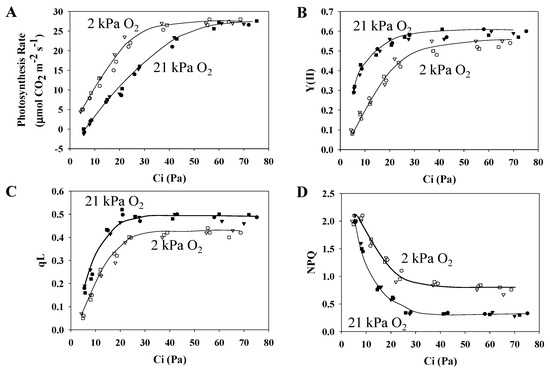 The following parameters were plotted against the leaf intercellular CO2 partial pressure (Ci) under the two pO2 conditions: the photosynthesis rate (Figure 1A), the PSII quantum yield (Y(II)) (Figure 1B), qL reflecting the QA redox state in PSII (Figure 1C), and NPQ (Figure 1D).