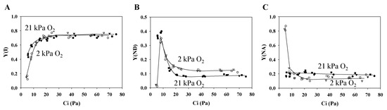 The quantum yields of PSI were plotted against Ci under the two pO2 conditions: Y(I) (Figure 2A), Y(ND) (Figure 2B), and Y(NA) (Figure 2C).
