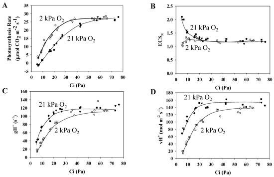 The following parameters were plotted against Ci, under normoxic and hypoxic conditions: the photosynthesis rate (Figure 3A), ECSN (Figure 3B), gH+ (Figure 3C), and the ECSN decay rate (vH+) (Figure 3D).