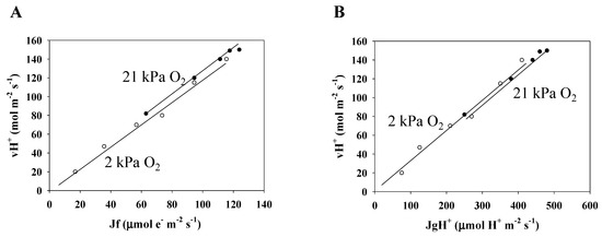 We examined the relationship between the electron flux in photosynthetic linear electron flow (LEF) and the H+ consumption flux of both photosynthesis and photorespiration in the thylakoid membrane. In this study, Jf, reflecting LEF, and vH+, were not measured simultaneously. Therefore, the Jf values were plotted against A + Rd, based on Figure 1 (Figure S2A). The relationships between Jf and A + Rd are shown by the arbitrarily drawn lines, which represent the trend of the data. Furthermore, the vH+ values were plotted against A + Rd based on Figure 3 (Figure S2B). The relationships between vH+ and A + Rd are shown as the same as with Jf. In Figure S2A,B, Jf and vH+ were sampled at the same values of A + Rd, on the basis of the arbitrarily drawn lines. Then, vH+ was plotted against the Jf values (Figure 4A). Under the two pO2 conditions, vH+ showed a positive linear relationship with Jf, with an origin of zero. These results agree with those of Avenson et al. [26] Kadota et al. [38] reported that the electron flux in ferredoxin (Fd)-dependent cyclic electron flow (CEF) activity is negligible compared to the electron flux in LEF under high light intensity conditions [38]. Therefore, it is implied that in a steady state, vH+ is equal to the rate of H+ accumulation in the thylakoid lumen driven by LEF.