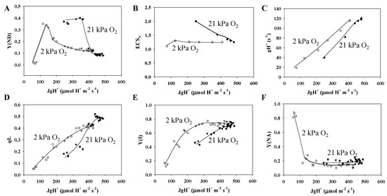 Relationships between Y(ND) and JgH+, ECS and JgH+, gH+ and JgH+, qL and JgH+, Y(I) and JgH+, and Y(NA) and JgH+. The data for each parameter were taken from Figure 1, Figure 2 and Figure 3, and Figure S3 (see further details in the text). (A) Y(ND), (B) ECSN, (C) gH+, (D) qL, (E) Y(I), and (F) Y(NA) were plotted against JgH+ at 21 and 2 kPa O2. Closed symbols, 21 kPa O2; open symbols, 2 kPa O2. Lines in the graphs were arbitrarily drawn to indicate the trends of the data.