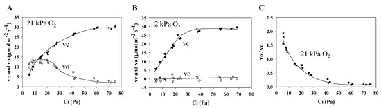 Influence of the intercellular partial pressure of CO2 (Ci) on both the ribulose 1,5-bisphosphate (RuBP) carboxylase reaction rate (vc) and the RuBP oxygenase reaction rate (vo) in wheat leaves. Photosynthesis rates were measured at 21 and 2 kPa O2, at 500 µmol photons m−2 s−1, simultaneously with the measurement of chlorophyll fluorescence. Both vc and vo were estimated from the photosynthesis rates and the values of Y(II) [21]. Data were obtained from Figure 1 (sample 1, circle; 2, square; 3, triangle). (A) Both vc and vo were plotted against Ci at 21 kPa O2. Closed symbols, vc; open symbols, vo. (B) Both vc and vo were plotted against Ci at 2 kPa O2. Closed symbols, vc; open symbols, vo. (C) The values of vo/vc at 21 kPa O2 were plotted against Ci. Lines in the graphs were arbitrarily drawn to indicate the trends of the data.