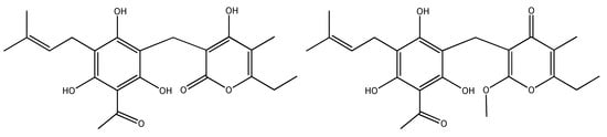 - Jakupovic, J.; Zdero, C.; Grenz, M.; Tsichritzis, F.; Lehmann, L.; Hashemi-Nejad, S.M.; Bohlmann, F. Twenty-one acylphloroglucinol derivatives and further constituents from south african Helichrysum species. Phytochemistry 1989, 28, 1119–1131. [Google Scholar] [CrossRef]