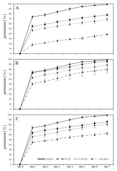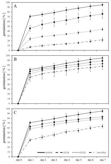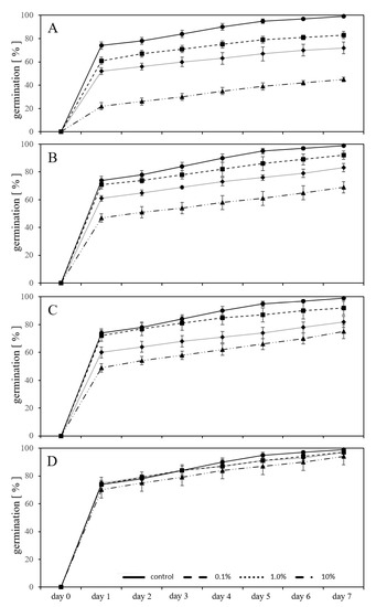 Garden cress (Lepidium sativum L.) seeds (Art. No. G250) were purchased from Bingenheimer Saatgut AG (Echzell, Germany). Seeds were carefully selected by removing small seeds or any deformed or damaged seeds. The seeds were then washed in distilled water to remove possible impurities. The batch used for all experiments exhibited a germination percentage of 99%. Germination experiments were performed at 25 °C ± 1 °C under 1500 lux light and a light-dark cycle of 12:12 h for seven days in total.