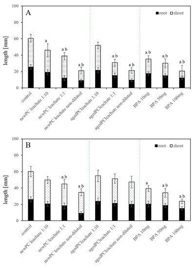 Measurement of the root and seedling length, as sub-lethal endpoints, in substrate-free exposures resulted in a concentration-dependent inhibition using the new-PC-leachate, the aged-PC-leachate, and BPA (Figure 4A). In general, the root length was reduced in all exposures (p < 0.05). The root growth reduction is concentration-dependent with leachates originating from new-PC and aged-PC, as well as using different BPA concentrations. Using the non-diluted new-PC-leachate, the reduction compared to the untreated controls is 64%. Similarly, with the non-diluted aged-PC-leachate, the root growth was inhibited by 63%. The highest reduction was observed in exposures with non-diluted leachate and 100 mg/L BPA (p < 0.05). The inhibition of root growth in seedlings exposed to BPA in high concentrations (17.2 or 50 mg/L) was also detected in soybean, wheat, and lettuce after seven days of growth [31,32]. The most provoked effect was measured in exposures with 100 mg/L BPA showing 52% smaller seedlings, compared to untreated controls. In soybean seedlings, the root length was reduced when exposed to 17.2 and 50 mg/L BPA [31]. The seedling length was adversely affected in all treatments (p < 0.05) in respect to untreated controls, which was concentration-dependent using new-PC-leachate, aged-PC-leachate, as well as in the BPA exposures. Using the new-PC-leachate, growth was reduced by 23% using the 1:10 and the 1:1 dilutions of the leachate and by 66% with the non-diluted leachate compared to untreated controls. With age-PC-leachate, the inhibition of seedling length was 13%, 56%, and 67% for exposure to the dilutions 1:10, 1:1 and non-diluted leachate in relation to untreated controls. Exposures to BPA showed a reduced seedling length of 50%, 57%, and 77% compared to the untreated control seedlings. Results indicated that there are adverse effects on root and total seedlings growth under the influence of plastic leachates. Especially with a higher leachate concentration (non-diluted), the adverse effects on smaller length was mostly over 66% in respect to untreated controls. As stated by Nicola [33], the root architecture is most vital for plant productivity. Therefore, the good growth of the primary root length of seedlings may determine the optimum root systems and influence the entire life cycle of this plant. For agriculturally used plants, this may also determine the later yield of this plant [34].