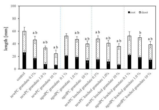 Testing the different PC granules, new-PC, aged-PC, and already leached new-PC and aged-PC-granules in substrate system exposures (Figure 5) exhibited inhibitory effects on root length and total seedling length. Compared to the untreated controls, exposure to the new-PC-granules mixed in substrate resulted in the root growth being inhibited by 35% (0.1% new-PC-granules mixed in the substrate), 71%, and 76% (1% and 10% new-PC-granules mixed in the substrate) (p < 0.05). Artificially aged-PC-granules exhibit a lesser inhibition of 8% (0.1% aged-PC-granules mixed in substrate) and 17% as well as 22% (1% and 10% aged-PC-granules mixed in substrate) (p < 0.05). The same experimental set up using previously leached granules from new-PC and aged-PC batches revealed a root growth inhibition of 4%, 14%, and 14% respectively. Rillig et al. [27] proposed that MP in soil could lead to reduced roots penetration resistance, as well as better soil aeration, which would promote root growth [35]. However, in the present study, this was not the case, presumably because the effects of substances leaching from the MP was greater than the added benefits of MP.