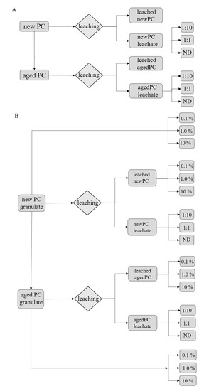 For the substrate-free exposures (Figure 6A), the new PC (new-PC-granules) material was used. Parts of the new PC material was artificially aged (aged-PC-granules) as described above. Both batches were then separately leached, as described above, to gain a leaching solution for the substrate-free experiments (new-PC-leachate; aged-PC-leachate). The leaching solution was diluted with ISO reconstitutes water 1:10, 1:1, and also non-diluted was used. For the substrate-based exposures (Figure 6B), new PC granules were used directly and mixed in the substrate in a ratio of 0.1%, 1.0%, and 10% (w/w). Parts of the new PC material was leached to gain a leaching solution (new-PC-leachate) and leached PC material (new-leached-PC). The leaching solution was diluted 1:10 and 1:1, as well as non-diluted, were used for the exposures. The leached PC material was mixed in the substrate in the ratio of 0.1%, 1.0%, and 10% (w/w). A batch of the new PC material was again artificially aged. Parts of this material was directly mixed in the substrate in the ratio of 0.1%, 1.0%, and 10% (w/w). Another part was leached to gain leached, aged PC material (aged-leached-PC) and the leaching solution of aged PC material (aged-PC-leachate). Leaching solution was diluted 1:10, 1:1, and also non-diluted were used for the exposures. The leached, aged PC material was mixed in the substrate in the ratio of 0.1%, 1.0%, and 10% (w/w).