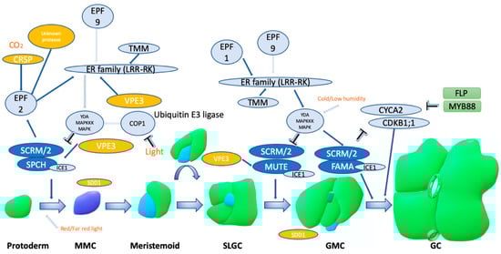 In higher plants, leaf gas fluxes primarily take place through stomata, which are actively regulated pores on the leaf surface [,,]. The starting point of stomatal development is the protodermal stem cells which are differentiated in succession to Meristemoid Mother cells (MMC), Meristemoids, Guard Mother Cells (GMCs) and finally to Guard Cells (GC). This process is driven by three closely related transcription factors (SPEECHLESS (SPCH), MUTE and FAMA). The regulation of the SPCH, MUTE and FAMA mechanism is achieved with an array of other proteins and transcriptional factors exhibiting complex interactions allowing for its fine tuning according to the external stimuli. Indeed, hormonal and environmental signals are proven to affect this process by targeting specific of the plethora of regulators that affect the SPCH, MUTE and FAMA mechanism [,,] (Figure 1).