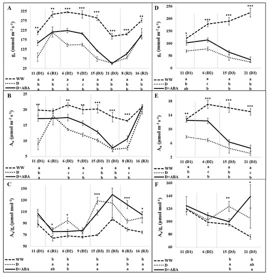 Evolution of stomatal conductance (gs), net photosynthetic rate (An) and intrinsic water use efficiency (An/gs) at morning (A–C) and midday (D–F) periods of days of drought (D1, D2, D3) and recovery (R1, R3) in each cycle, in leaves of well-watered (WW) and droughted without (D) and with abscisic acid (D + ABA) plants. Each point is average and vertical bars represent the S.E. (n = 8). Different letters indicate significant differences among treatments within each date (* p < 0.05, ** p < 0.01, *** p < 0.001).