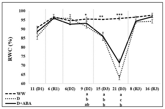 Changes of relative water content (RWC), of days of drought (D1, D2, D3) and recovery (R1, R3) in each cycle, in leaves of well-watered (WW) and droughted without (D) and with abscisic acid (D + ABA) plants. Each point is average and vertical bars represent the S.E. (n = 8). Different letters indicate significant differences among treatments within each date (* p < 0.05, ** p < 0.01, *** p < 0.001).
