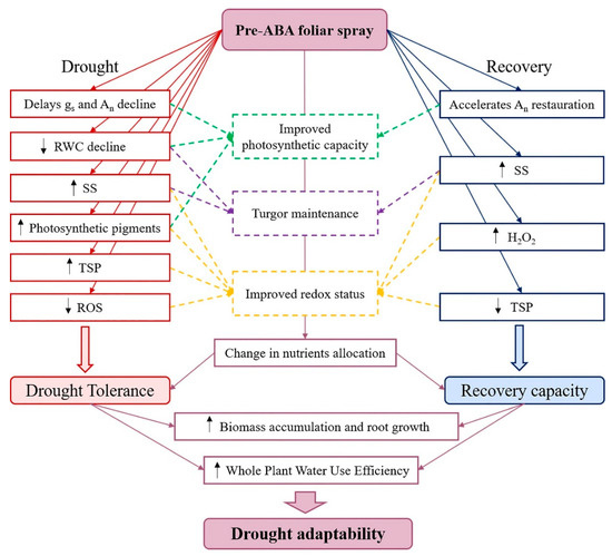 The foliar application of ABA before withholding water improved both drought tolerance and recovery capacity, i.e., drought adaptability, of young olive trees in outdoor conditions, as illustrated in Figure 4. The addition of ABA contributed to delay the negative drought effects on gs and An, to improve the turgor maintenance associated with osmotic adjustment and to reduce the drought-induced water status decline and oxidative stress. Even if not directly, ABA application improved the physiological and biochemical functions during the recovery, as the plant’s capacity of recovery from previous drought is dependent on the severity of the damages caused by the previous stress. The modulation of ionome in ABA-sprayed plants also suggests that the hormone changed the nutrients requirement and their allocation among the different plant organs, with special influence in K, N and B accumulation in roots. As a consequence, the ABA-triggered changes in plant functions attenuated the drought-induced decline in biomass accumulation, induced root growth and enhanced water use efficiency after successive drought-rewatering cycles. These changes are likely to be of real adaptive significance, with important implications for plant growth and productivity when plants are exposed to challenging environments, as commonly occurs in Mediterranean ecosystems. Moreover, as the experiment allowed the plants to growth under near-natural circumstances, the results might be transferable to field conditions.