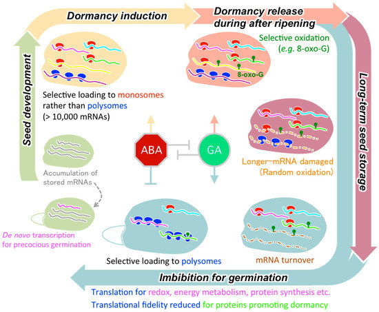 After maturation, the water contents of dry, orthodox seeds are normally less than 20%, and the cytoplasm of seed cells becomes highly viscous and is transformed into a glass [52]. In the glassy state, cellular components are stabilized and their mobility is severely restricted, preventing enzymatic reactions with free available water. Several studies have shown that active transcription/translation (recruitment of mRNAs to polysomes) does not occur during after-ripening of seeds in a fully dry state [53,54,55,56], raising the question of how dormancy is lost in dry, metabolically inactive seeds. Major molecular events occurring in dry seeds are, therefore, limited to passive and non-enzymatic reactions such as oxidation and Amadori–Maillard reactions. RNA is particularly exposed to oxidation, partly due to its single-stranded structure [57], and it is generally considered that in the absence of efficient repair systems, damaged RNA is enzymatically degraded rather than restored [58]. In fact, oxidation of stored mRNAs to alleviate dormancy has been observed in sunflower during after-ripening [59]. Although ‘passive’, this mRNA oxidation in seeds was not random but highly selective, mainly targeting stored mRNAs encoding proteins involved in cell signaling such as the protein phosphatase 2C PPH1, mitogen-activated protein kinase phosphatase 1, and phenyl ammonia lyase 1. An in vitro translation assay also demonstrated that mRNA oxidation caused suppression of protein synthesis with both oxidized and non-oxidized mRNAs associating with ribosomes, but the presence of oxidized bases reducing translation fidelity and increasing the formation of truncated proteins [60]. Similar selective mRNA oxidation was found in after-ripened wheat seeds, although none of the oxidized mRNAs corresponded to a gene orthologue of those identified in sunflower, implying that the mRNAs targeted for after-ripening-induced oxidation are distinct between species [61,62]. These suggest that seed dormancy release by dry after-ripening is associated with targeted mRNA oxidation, which could lead to translational repression of the corresponding proteins during imbibition.