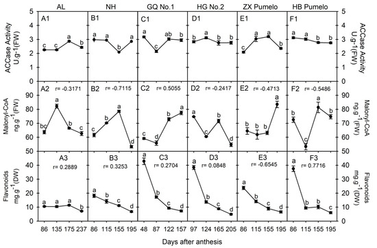 2.6. Changes in Acetyl-CoA Carboxylase Activity (ACCase), Malonyl-CoA and Flavonoids Concentration during Fruit Development and Ripening