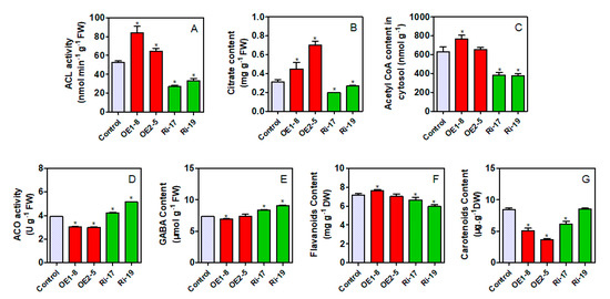 2.7. Change in ACL Activity Could Alter the Cyt-ACO Activity as well as Citrate, Acetyl-CoA, GABA, Total Flavonoids, and Carotenoids Concentrations