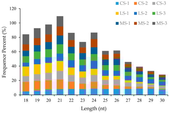 Small-RNA length distribution in Reaumuria soongorica seeds. CS, without salt stress; LS, optimum salt concentration for germination; MS, threshold salt concentration for germination.