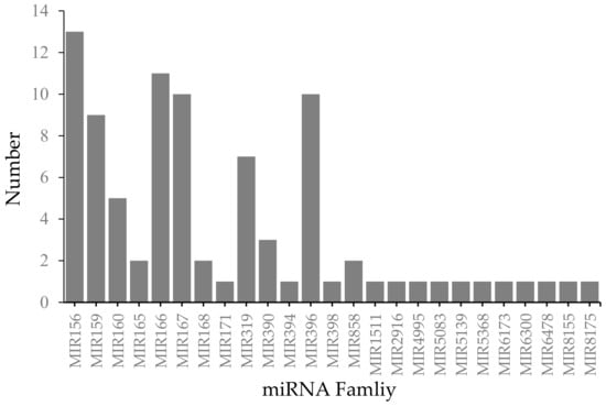 miRNAs are an important class of non-coding regulatory small RNAs involved in gene regulation in most eukaryotic cells. Many studies have indicated that miRNAs are widely involved in a variety of stress responses, including responses to drought, cold, salinity, oxidative stress, and viruses [39,40,41,42,43,44,45]. Consequently, tremendous efforts have been made to study miRNAs in various plant species. Traditional methods for discovering and identifying miRNAs, such as Sanger sequencing and bioinformatics prediction, are time-consuming and labor-intensive. In addition, this type of technology has difficulty detecting novel or low-abundance miRNAs. High-throughput sequencing technology, which is rapid and efficient, is ideal for the study of novel or low-abundance miRNAs and the analysis of small-RNA clusters at multiple stages of plant development under various natural environmental stress conditions [46,47].