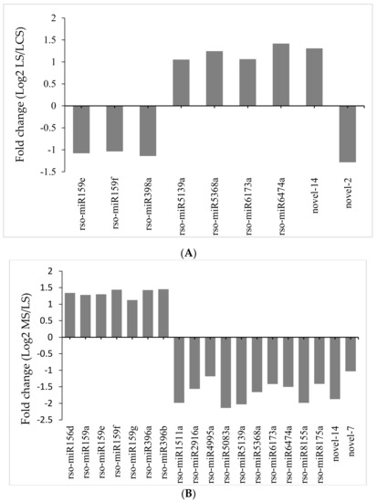 Comparison of relative expressions of differentially expressed miRNAs. (A) Relative expressions of miRNAs between LS (optimum salt concentration for germination) vs. CS (without salt stress) libraries. (B) Relative expressions of miRNAs between MS (threshold salt concentration for germination) and LS libraries.