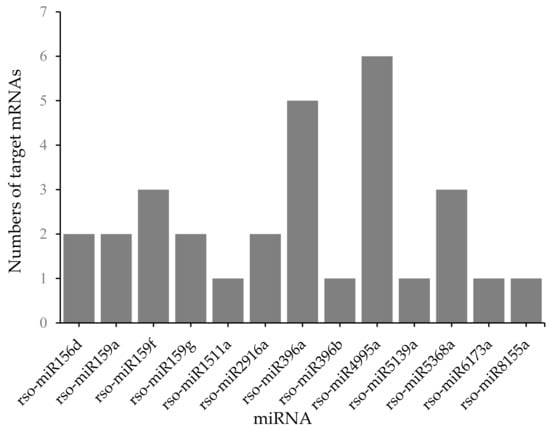 Obvious differences in abundance, as reflected by library read counts, were observed among these miRNA families (Table S1). To compare expression levels in this study, we calculated the average transcripts per million reads (TPM) of each miRNA in nine libraries [31,32,33]. After TPM standardization, rso-miR171a had the lowest expression level and a relatively low abundance (92.13 TPM), while the highest relative expression level was that of rso-miR159a (146,916.58 TPM), followed by rso-miR159c (76,138.88 TPM) and rso-miR159b (73,930.26 TPM).