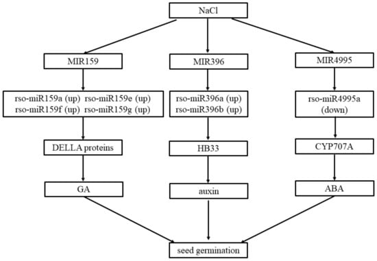We also found that CYP707A2, a key gene encoding ABA 8′-hydroxylase in ABA (abscisic acid) catabolism [59], is the likely target of MIR4995. In Arabidopsis, CYP707A genes encode ABA 8′-hydroxylases and are involved in many physiological processes [60]. Previous experiments have demonstrated that ABA 8′-hydroxylase genes, such as CYP707A1 and CYP707A2 in Arabidopsis, play prominent roles in the regulation of endogenous ABA levels during seed dormancy and germination [59,60,61,62]. In contrast to results comparing LS with CS, rso-miR4995a exhibited a downward-regulated trend in MS relative to LS. MIR159 putatively targets mRNAs encoding GA (gibberellin)-MYB (v-myb avian myeloblastosis viral oncogene homolog) transcription factors that interact with GA-response elements and participate in short-day floral initiation and anther development [63,64]. Interestingly, the expression of miR159 is repressed in the absence of GA, possibly through the action of DELLA proteins (named for a conserved pentapeptide motif) that are in turn targeted for GA-induced proteolysis [63]. The MIR159 family exhibited an upward-regulated trend in MS relative to LS, which contrasts with its down-regulation in LS compared with CS. These results may reflect a unique regulatory mechanism used by halophyte seeds during germination under salt stress. On the basis of our results and previous research, we hypothesize that R. soongorica quickly activates miRNA regulatory mechanisms under salt stress and further regulates GA, auxin, and ABA pathways, thereby regulating the germination ability of its seeds under salt stress (Figure 5). These results indicate that R. soongorica may inhibit seed germination by reducing auxin and gibberellin levels and increasing ABA concentrations under high salinity. This regulatory mechanism ensures that R. soongorica halts germination under high salt stress but can survive periods of high salinity (i.e., salt concentrations exceeding the level that R. soongorica can tolerate during the germination period) and germinate under low-salt conditions (i.e., within the salt-stress concentration range that R. soongorica can tolerate during the germination period) to improve survival.