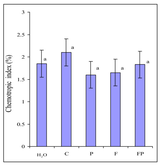 Directed growth of Fusarium culmorum macroconidia germ tubes to water (H2O) and to exudates of: control barley (C), barley colonized by Pseudomonas fluorescens (P), barley colonized by F. culmorum (F), barley colonized by both P. fluorescens and F. culmorum (FP). Data are presented as the mean from two experiments. n = 600 germ tubes. Error bars show standard deviation. Values of different letters are significantly different at p ≤ 0.05 when applying Fisher’s LSD test.