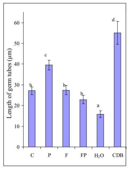 Length of germ tubes of Fusarium culmorum macroconidia after 6 h of incubation in solutions of exudates of control barley (C), barley colonized by P. fluorescens (P), barley colonized by F. culmorum (F) and barley colonized by both P. fluorescens and F. culmorum (FP), in sterile water (H2O), in liquid medium (CDB). Data are presented as the mean from two experiments. n = 300 macroconidia. Error bars show standard deviation. Values of different letters are significantly different at p ≤ 0.05 when applying Fisher’s LSD test.
