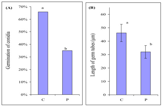 Germination of Fusarium culmorum macroconidia (A), length of germ tubes of F. culmorum macroconidia (B) after 6 h of incubation in the mineral medium in the absence (C) and presence of P. fluorescens (P). n = 300 macroconidia. Significant differences in germination of macroconidia were analyzed using Mann–Whitney U-test. Error bars show standard deviation. Values of different letters are significantly different at p ≤ 0.05 when applying Fisher’s LSD test, and at p ≤ 0.01 when applying Mann–Whitney U-test.