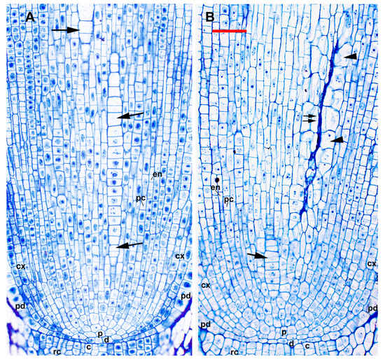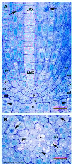 Normal organization of tissues in the promeristem and primary meristem zones of teosinte roots at high magnification. (A) Slightly off-median longitudinal section. (B) Transverse section through the plerome showing a margin initial during cytokinesis (arrowhead) and another in mitosis (arrow). Late-maturing metaxylem (LMX) vessel; asterisk (*), plerome central cell; arrow, mitotic cell; arrowhead, newly forming cell plate; c. calyptrogen; d. dermatogen/periblem complex; p, plerome; cx, cortex; en, endodermis; pc, pericycle; pd, protoderm; rc, rootcap. Scale bar = 25 µm. Modified from Saito et al. 2019 [], cf. Figure 1.