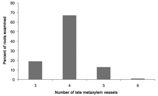 - Heimsch, C. Development of vascular tissues in barley roots. Am. J. Bot. 1951, 38, 523–537. [Google Scholar] [CrossRef]