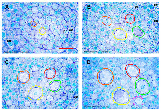 Normal LMX and first early metaxylem (EMX) development revealed by representative transverse sections from among ca. 600 serial sections taken from one teosinte primary root. The micrographs are centered on the stele. (A) Appearance of first (encircled yellow) and second (orange) LMX (38 µm from the rootcap junction [RCJ]). (B) All four LMX present (78 µm from RCJ); third (green), fourth (red). (C) 110 µm from RCJ. (D) First EMX (magenta) appeared by 204 µm from RCJ. EMX, early metaxylem; LMX, late metaxylem vessel; cx, cortex; en, endodermis; pc, pericycle. Scale bar = 25 µm.