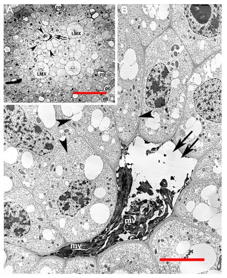 It has been reported that as tracheary elements complete their differentiation, the cytoplasm breaks up into “cytoplasmatic spherules”, some of which contain organelles, that enter the central vacuole and ultimately become digested [,,]. In the present study, the cytoplasm in the LMX elements of the abnormally developing steles was observed to become condensed and subdivided into irregularly-shaped macrovesicles seemingly pressed together as the cells collapsed inward (Figure 6B). We speculate that these macrovesicles are analogous to the cytoplasmatic spherules reported by Wodzicki and Humphries [,], but are malformed presumably as a consequence of autolysis being executed prematurely.