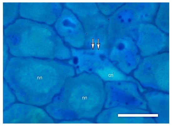Procedures for EM were per Niki et al. []. Root tip segments (2–3 mm long) of abnormally-developing roots were immediately immersed in 2.4% (v/v) glutaraldehyde/0.3% (w/v) paraformaldehyde in 0.02 M phosphate buffer (pH 7.2) and gently shaken overnight at room temperature, then immersed in 0.025% (w/v) tannic acid for 3 h. Specimens were post-fixed in 0.1% (w/v) osmium tetroxide at 4 °C for 1 h. After fixation the segments were rinsed several times in buffer before being rinsed in distilled water, dehydrated by alcohol series, and embedded in Spurr epoxy resin. Embedded specimens were sectioned transversely at 0.07 µm, stained with saturated uranyl acetate and Reynold’s lead citrate solution, and mounted on copper specimen grids for observation using a Hitachi H300S transmission electron microscope (Hitachi Ltd., Tokyo, Japan) at 75 KV. Some 2 µm sections were made afterward from the same block, stained with toluidine blue O, and used for comparative LM (Figure 7A).