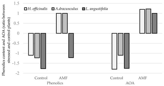 | Species | Treatment | Essential Oil Component % | AOA mg GAE g−1 | Phenolics mg GAE g−1 | |