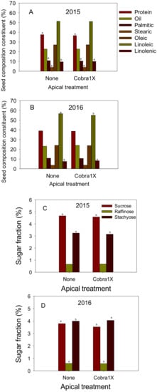 Effect of apical treatment of Cobra1X (rate of 12 oz/ac = 0.88 L ha−1) on seed protein, oil, and fatty acids palmitic, stearic, oleic, linoleic, and linolenic (%) in 2015 (A) and 2016 (B); Effect of apical treatment of Cobra1X (rate of 12 oz/ac = 0.88 L ha−1) on seed sugars (sucrose, raffinose, and stachyose) (%) in 2015 (C) and 2016 (D). Bars with the same colors and patterns with different letters are significantly different at P = 0.05. Bars without letters are not significant.