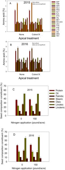 Effects of apical and nitrogen applications are shown in Figure 1A–D, Figure 2A–D, and Figure 3A–D). In 2015, apical application of Cobra1X resulted in a higher content of some seed composition constituents, including fatty acids stearic and linolenic, and some amino acids, including GLU, LYS, and ASP (Figure 1A,C and Figure 2A). The rest of the seed composition constituents either did not change such as oil and amino acids PHE and LYS, or decreased such as protein, palmitic acid, and amino acids ASP, SER, LEU, and ARG, and sucrose and stachyose. In 2016, the apical application resulted also in higher linolenic acid and amino acids PRO, GLY, and VAL, and stachyose (Figure 1B,D and Figure 2B). Some constituents decreased such as protein, linoleic acid, and amino acids ASP, GLU, and ARG, sucrose, and raffinose and no changes were noticed in some constituents, including palmitic and oleic acid acids, and the rest of amino acids.