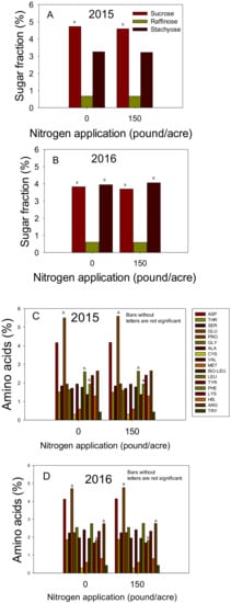 Effect of nitrogen (N) application at a rate of 0 or 150 lbs N ac−1 (0 or 168 kg ha−1) on seed sugars (sucrose, raffinose, and stachyose) (%) in 2015 (A) and 2016 (B); Effect of nitrogen (N) application at a rate of 0 or 150 lbs N ac−1 (0 or 168 kg ha−1) on seed amino acids (%) in 2015 (C) and 2016 (D). Bars with the same colors and patterns with different letters are significantly different at P ≤ 0.05. Bars without letters are not significant.