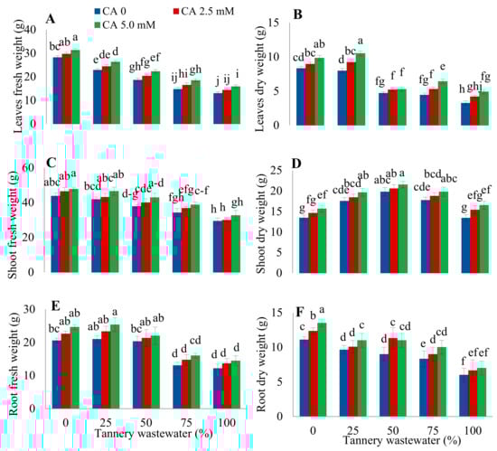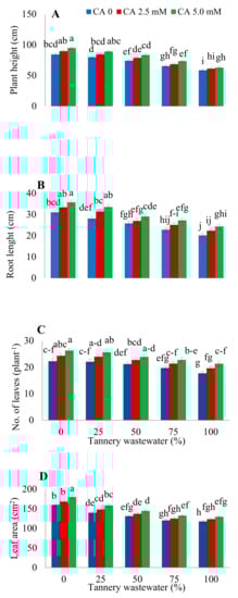 Growth features of sunflower plants under various treatments of tannery wastewater, along with application of CA, are presented in Figure 1 and Figure 2. Findings revealed that increasing concentration of wastewater treatment progressively reduced the plant height, root length, number of leaves per plant, and the leaf area (Figure 1), along with the fresh and dry weight of root, shoot, and leaves of sunflower (Figure 2). The highest decrease in the abovementioned parameters was noticed upon 100% wastewater treatments. However, CA application remarkably improved all the studied agronomic traits, both under stressed and normal growth environments. The maximum ameliorative effect of CA was observed at 5.0 mM foliar application treatment.