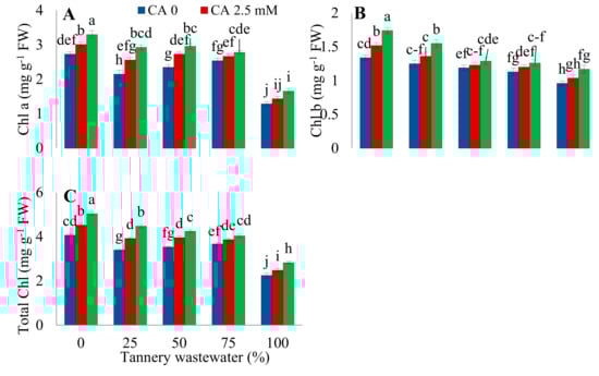 It is a well-established fact that photosynthetic pigments perform a very crucial role in a plants’ life due to their light harvesting function. Maqbool et al. [] reported that Cr stress significantly affected the physiochemical attributes of the plants. In the current study, wastewater treatment prominently decreased the photosynthetic pigments in sunflower plants (Figure 3). Chlorophylls a, b, and total chlorophyll abruptly reduced with increasing tannery wastewater concentration. Reduction in plant growth may be attributed to the occurrence of high Cr concentrations in wastewater, which may have caused the structural impairment to chloroplast [] and surplus generation of ROS under Cr induced stress []. Moreover, up-regulation of chlorophyllase under heavy metal stress constantly leads to an enormous reduction in chlorophyll pigments []. Citric acid application increased the chlorophyll contents in plants under tannery wastewater treatment. Similarly CA improved chlorophyll contents of wheat leaves under severe Cr toxicity []. Further, CA application also enhanced chlorophyll concentration in maize plants under drought condition []. Foliar application of CA caused an immense reduction in ROS generation and damage to the chloroplast, which resulted in an improvement in the pigment contents in plants [].