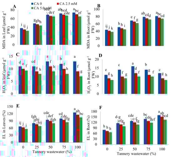 Increased MDA content is an indication of membrane damage []. In the current study, H2O2, MDA contents, and EL, were considerably enhanced in plant root and leaves of sunflower plants irrigated with tannery wastewater (Figure 3). However, CA treatment markedly ameliorated the lipid peroxidation and membrane damage by scavenging the free radicals and reducing ROS production [,].