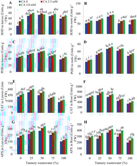 Wastewater treatment increased CAT activities at mild stress levels (25%) with a subsequent decreasing trend, both in the leaves and roots. However, CA supplementation further enhanced CAT activities in normal, as well as stressed plants in both plant parts. The effect of 5.0 mM CA concentration was the most prominent in improving CAT activities. Activities of APX were increased with a 25%–50% wastewater treatment, with a subsequent decrease under higher stress levels in both plant parts, i.e., leaves and roots. However, a 5.0 mM CA application significantly improved the APX activities of plants at all levels of wastewater treatment, as compared with those receiving no CA treatments.
