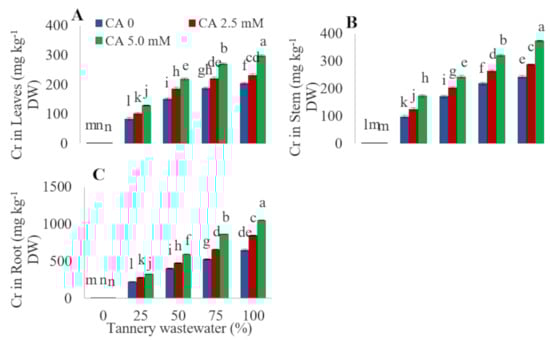 Increasing concentrations of tannery wastewater drastically increased Cr concentration in sunflower root, stems, and the leaves of sunflower plants (Figure 6). Roots exhibited a much higher amount of Cr as compared to stem and leaves of the sunflower. Similar results were observed in rice and oil-seed rapes [,]. This might be due to Cr immobilization by sugars as macromolecules [], followed by compartmentalization in root cell vacuoles []. Exogenous application of CA promoted uptake and accumulation of Cr towards different plant parts under various levels of tannery wastewater (Figure 6). However, Ali et al. [] observed that CA application significantly decreased the uptake of different metals and their translocations to upper parts of various plants. The CA-mediated restricted absorption of Cr, due to the protection of the membrane system of plants, and resultant increase in the uptake of essential nutrients, might be the possible reason for enhanced plant growth []. Organic substances like fulvic acid and humic acid are well known for their constructive effects on heavy metals’ mobility and bioavailability, because they formulate composite organo-metal complexes [,,]. Citric acid might have made complexes with Cr ions, which could be among many different possible reasons for the increase in Cr uptake by sunflower [].