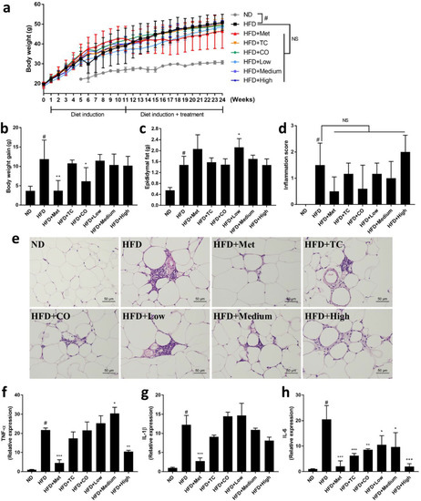 Figure 1. Effects of CO/TC formulations on (a) body weight, (b) body weight gain, (c) epididymal fat, (d) inflammatory index of adipose tissue, and (e) epididymal adipocyte microsections stained with H&E, and the relative expression of (f) TNF-α, (g) IL-1β, (h) IL-6 in epididymal adipose tissue. Values are means ± SD for n = 6, and analyzed by one-way ANOVA with Tukey post-hoc test. # p < 0.05 was considered significant for ND vs. HFD. *** p < 0.001, ** p < 0.01, * p < 0.05 vs. HFD group. NS, represents no significance difference (p > 0.05).