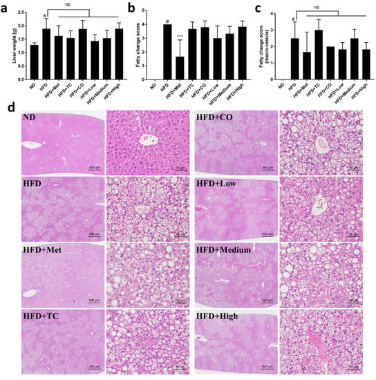 Figure 2. Effects of CO/TC formulations on hepatic steatosis (n = 6). (a) Liver weight. (b) Fatty change score of the livers. (c) Fatty change score with macro-vesicles of the livers. (d) Liver microsections stained with H&E. Data are reported as mean ± SD and analyzed by one-way ANOVA with Tukey post-hoc test. # p < 0.05 was considered significant for ND vs. HFD. *** p < 0.001 vs. HFD group. NS, represents no significance difference (p > 0.05).