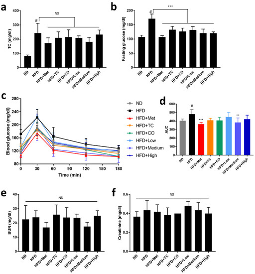 Figure 3. Effects of CO/TC formula on serum biochemical index (n = 6). (a) Total cholesterol. (b) Fasting glucose. (c) Oral glucose tolerance test and (d) its area under the curve (AUC). (e) Level of blood urea nitrogen. (f) Level of creatinine. Data are reported as mean ± SD and analyzed by one-way ANOVA with Tukey post-hoc test. # p < 0.05 was considered significant for ND vs. HFD. *** p < 0.001, ** p < 0.01 vs. HFD group. NS, represents no significance difference (p > 0.05).
