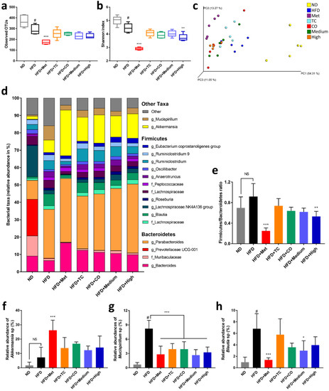 Figure 4. CO/TC formula alters gut microbiota composition in HFD-fed mice (n = 5). Alpha diversity assessed by (a) the Shannon index and (b) observed species. (c) Principal co-ordinate analysis (PCoA) of the weighted UniFrac metric for fecal microbiota. (d) Taxa summary of samples. OTUs were combined if their deepest taxonomic classifications were identical, and taxa with less than 1% abundance were combined into ‘Other’. (e) The ratio of Firmicutes to Bacteroidetes. (f) The relative abundances of genus Akkermansia. (g) The relative abundances of genus Mucispirillum. (h) The relative abundances of genus Blautia. Data are reported as mean±SD and analyzed by one-way ANOVA with Tukey post-hoc test. # p < 0.05 was considered significant for ND vs. HFD. *** p < 0.001, ** p < 0.01, * p < 0.05 vs. HFD group. NS, represents no significance difference (p > 0.05).