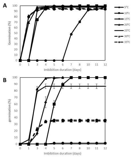 - Alvarado, V.; Bradford, K.J. A hydrothermal time model explains the cardinal temperatures for seed germination. Plant Cell Env. 2002, 25, 1061–1069. [Google Scholar] [CrossRef]