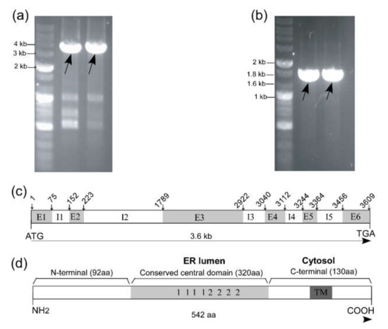 Amplicons of 1.8 kb (Figure 1a) and 3.6 kb (Figure 1b) were amplified from cDNA and genomic DNA, respectively. After DNA sequencing, intron–exon analysis revealed that the TrCNX1 genomic sequence comprised of six exons (E) and five introns (I) in its gene coding region (Figure 1b). NCBIs ORF finder analysis indicated that the cloned cDNA of TrCNX1 was 1629 bp in size and encoded a protein of 542 amino acids (Figure 1d) with a predicted theoretical molecular mass of 61.4 kDa and a pI of 4.69.