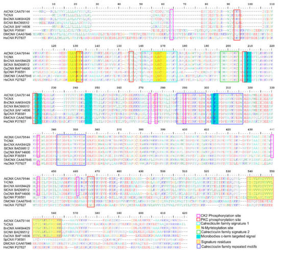 Comparison of deduced amino acid sequences of calnexin (CNX). Multiple sequence alignment of the TrCNX1 protein with various plant and non-plant CNX proteins. At, Arabidopsis thaliana (CAA79144); Tr, Tradescantia (KU530113); Br, Brassica napus (AAK84429); Sl, Solanum lycopersicum (BAD99512); Os, Oryza sativa (BAF14606); Sp, Saccharomyces pombe (P36581); Dm, Drosophila melanogaster (AAF48618); Hs, Homo sapiens (P27824.2). Distinct structural features of putative conserved signature motifs and critical amino acid sites among CNX alignments are shown by different colored boxes (pink, red, blue, green, and deep blue) and are highlighted by shaded boxes (yellow and cyan).